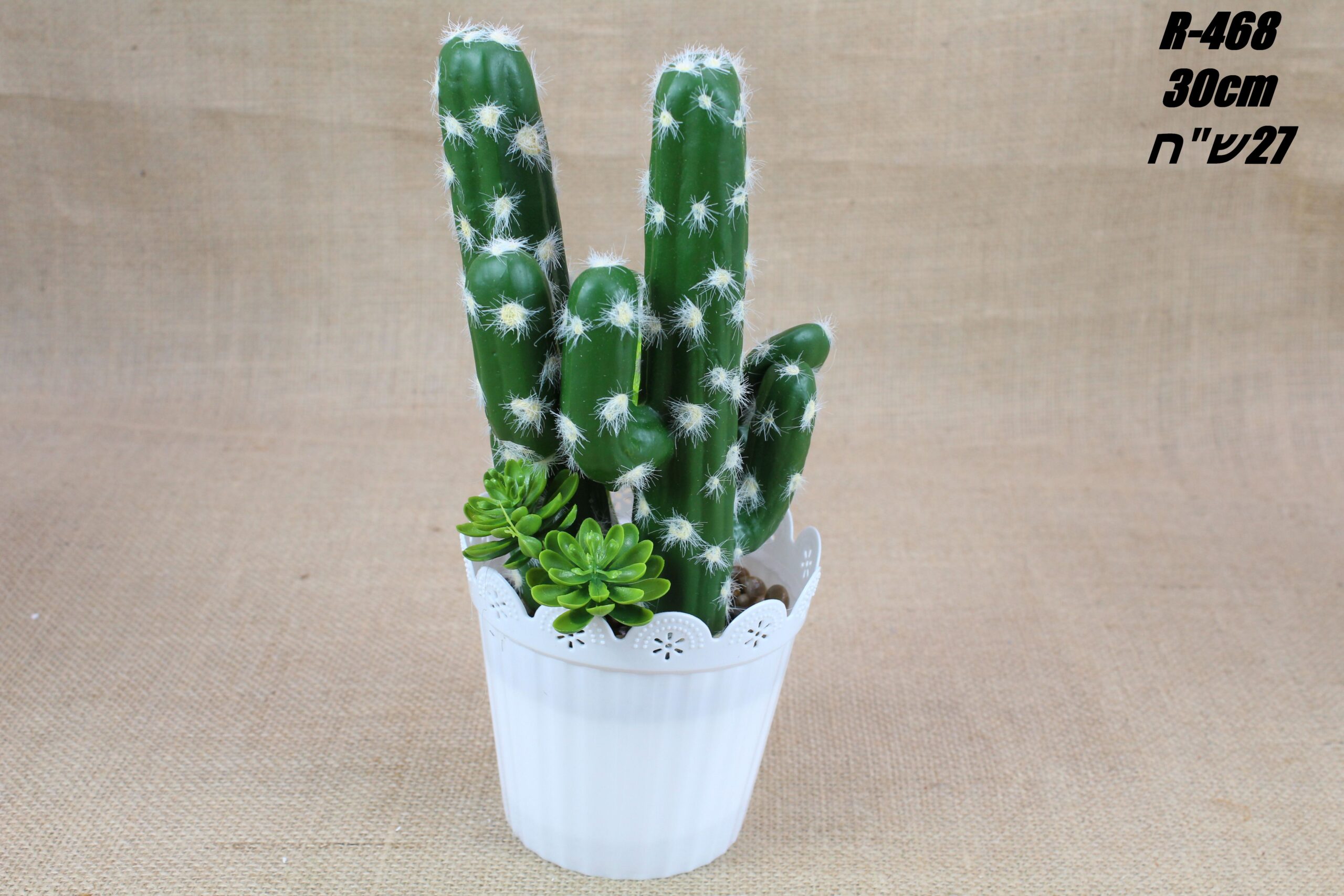 תיאור: קקטוס מלאכותי בכלי לבן עם קצה מחורץ. הקקטוס מציג פרטים מציאותיים עם שיער דוקרני קטן ומלווה בסוקולנטים קטנים יותר, מה שהופך אותו לפריט דקורטיבי מושלם עם תחזוקה נמוכה.