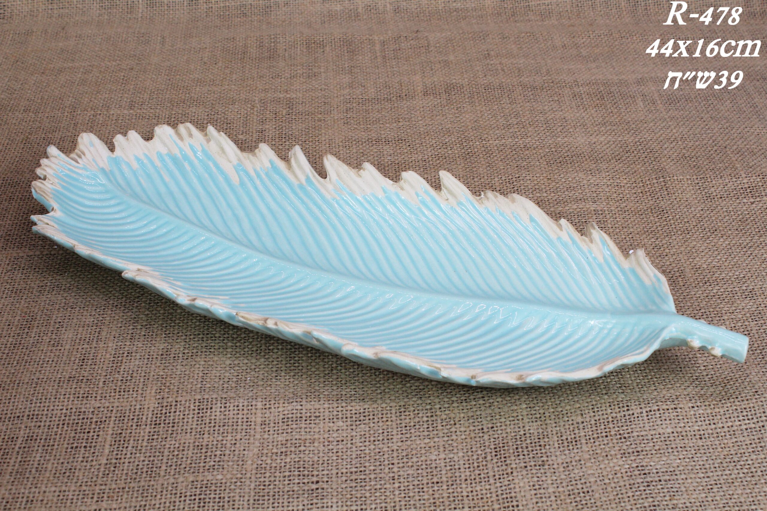 כלי בצורת עלה, צבע תכלת עם עיטורים, מתאים להגשה ולעיצוב שולחנות.
