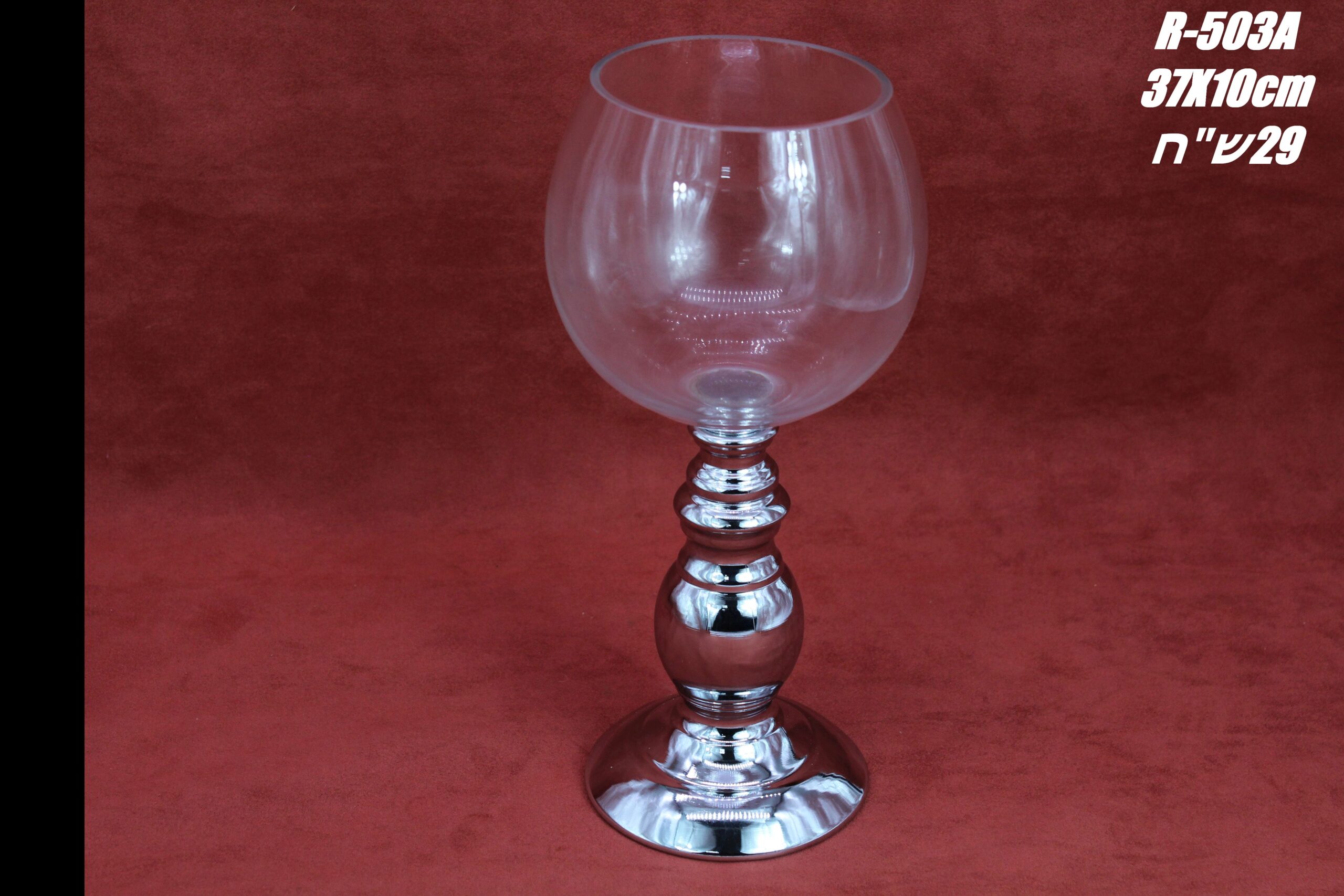 תיאור: אגרטל בצורת גביע גדול עם קערת זכוכית שקופה וגזע מתכתי מבריק, הופך אותו לפריט מרשים עבור מרכזי שולחן או תצוגות פרחים.