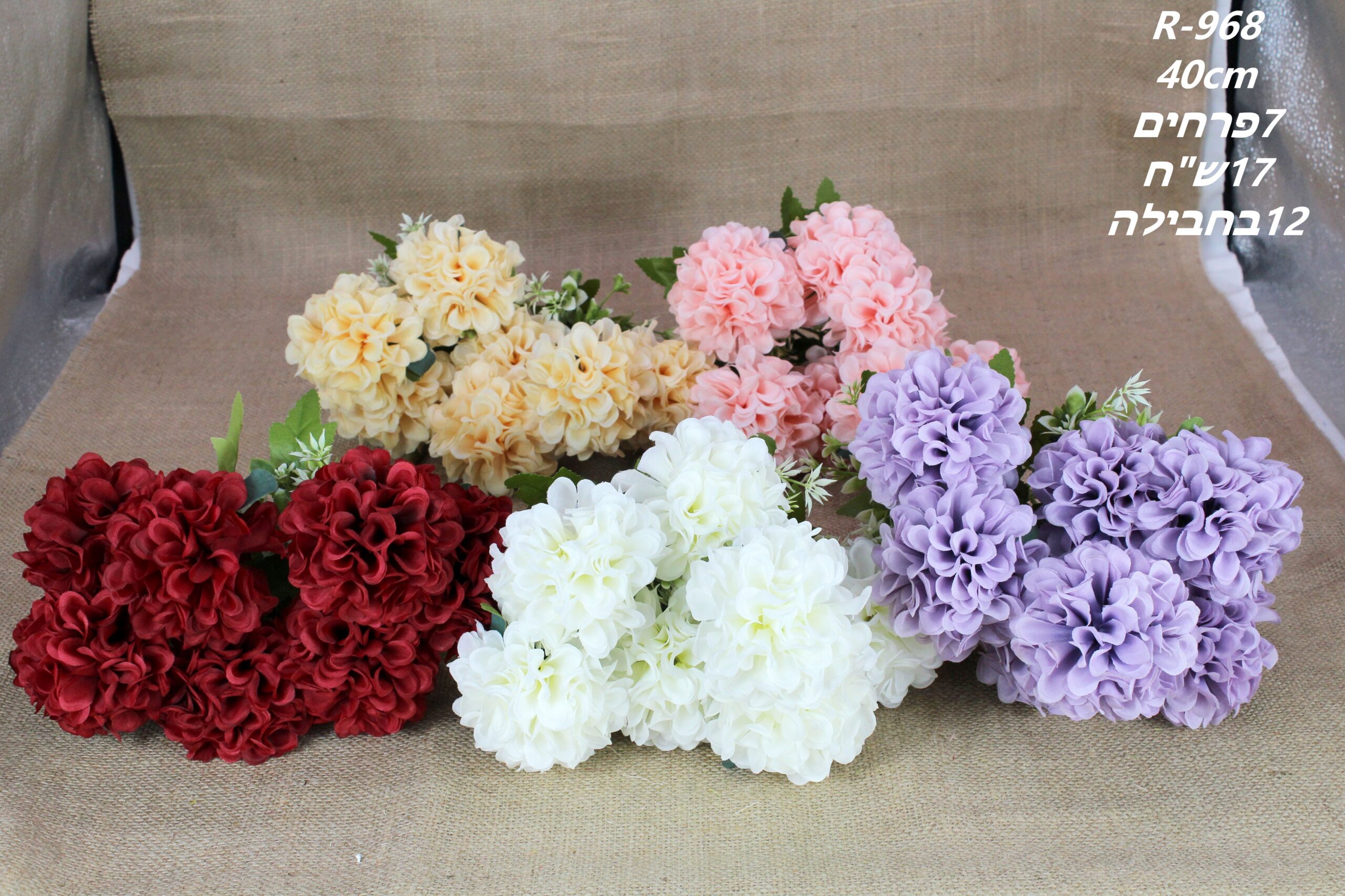 זר פרחים מלאכותיים בגוונים רכים עם שבעה פרחים. מתאים לסידורי פרחים חגיגיים ולעיצוב אירועים.